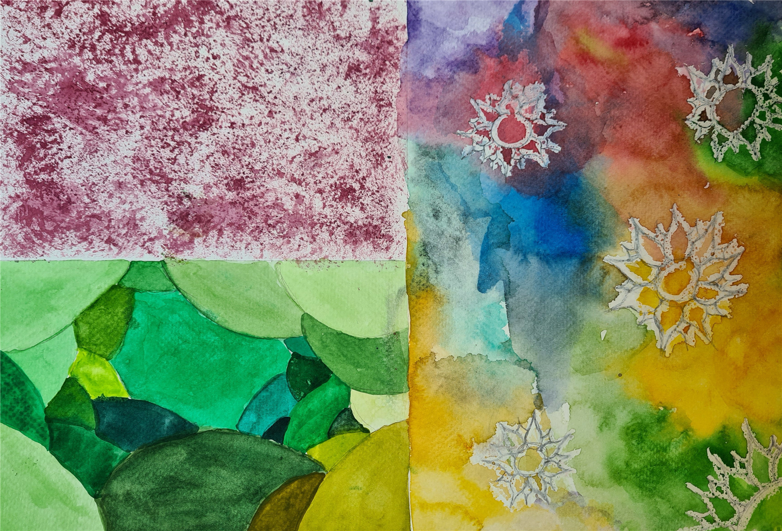 Nach einer Einführung in die Aquarelltechnik, erhalten die Kinder die Möglichkeit, die neu erlernten Fähigkeiten auf dem Papier umzusetzen.