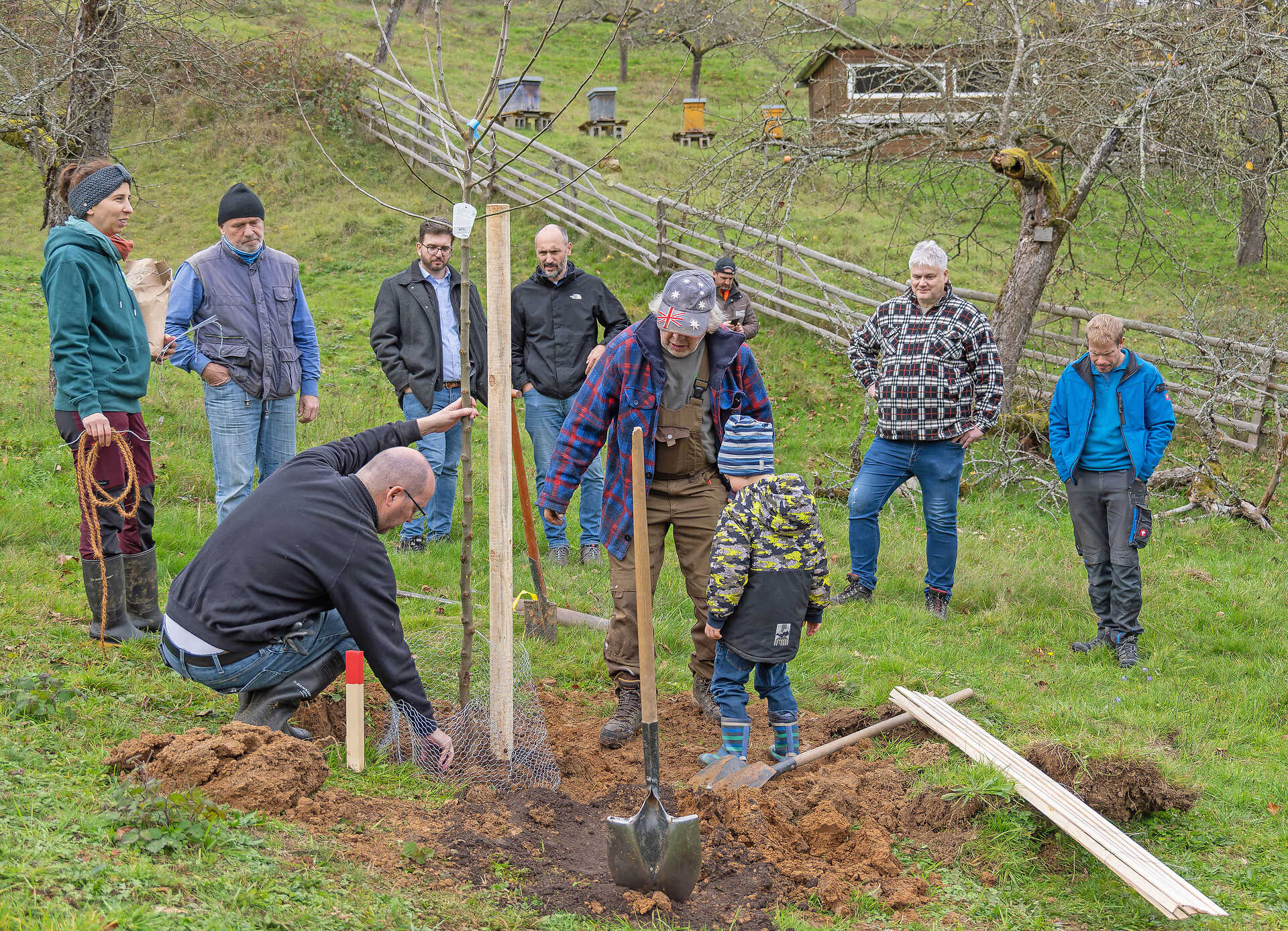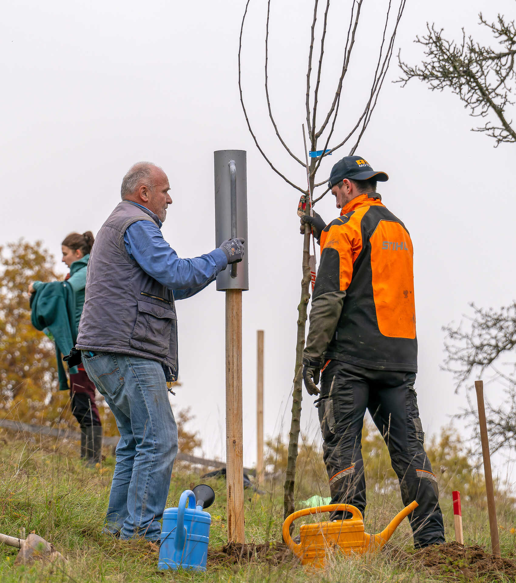 Bevor die Gäste die 40 Hochstämme – 30 Apfel- und zehn Birnbäume – pflanzten, gab Manfred Knippel (LPV), unterstützt von Wolfgang Ludwig und Teresa Bachmann (LPV), einen Crashkurs im Baumpflanzen: Da das Loch bereits ausgehoben war, führte Knippel die Gäste durch alle Arbeitsschritte vom Einbringen eines Wühlmauskorbs, dem Ausrichten und Setzen des Baums mit Stützpfahl, das Anbinden des Baums, der Zugabe von Schafwollpellets, dem Schließen des Pflanzlochs (mit der Maßgabe, die Veredlungsstelle nicht mit Erde zu bedecken) über das Bilden eines Gießrands (mit nach unten platzierten Grassoden) bis zum Anbringen eines Verbissschutzes. Reichliches Angießen sowie ein Pflanzschnitt schließen die Pflanzungen ab, erläuterte Knippel.