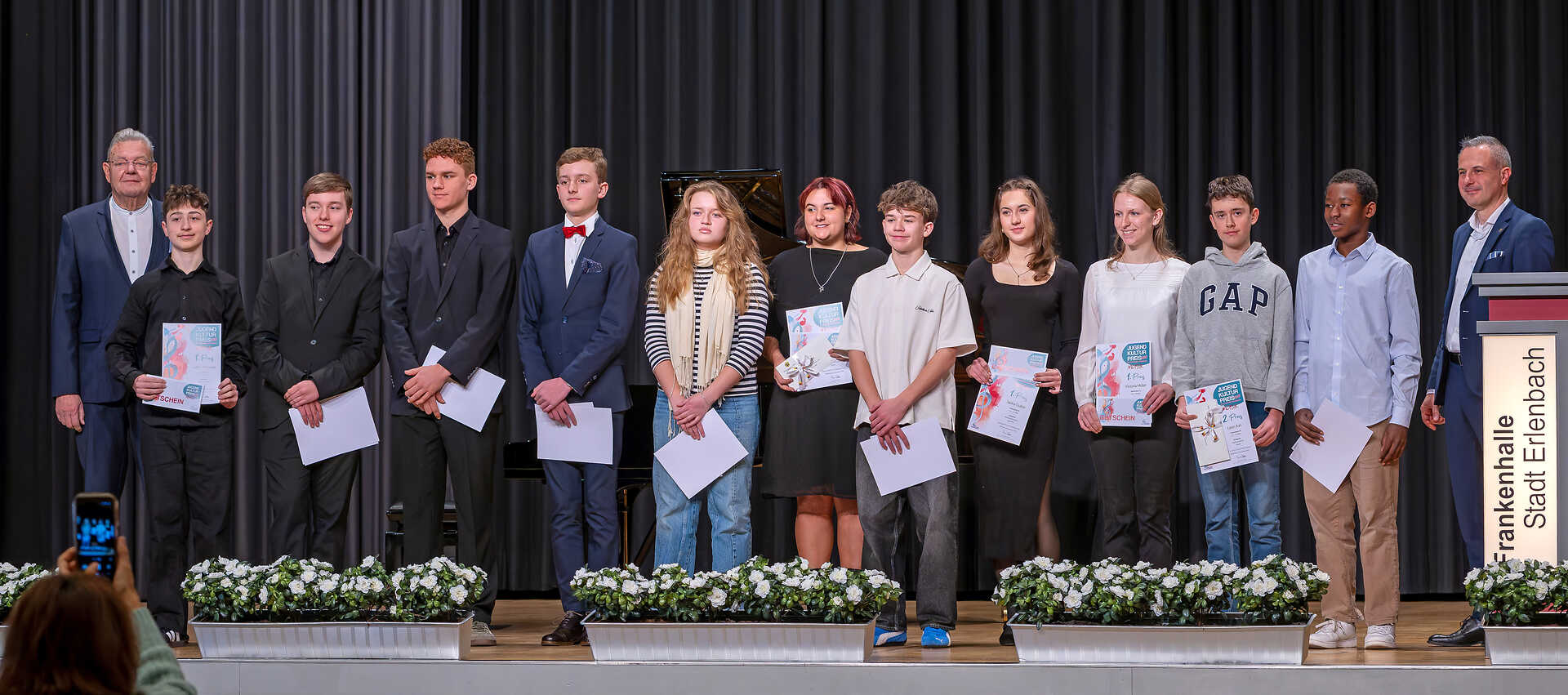 Auszeichnungen beim Jugendkulturpreis 2025 in den Altersgruppen Ia, Ib und II mit Landrats-Stellvertreter Günther Oettinger (links) und Erlenbachs Bürgermeister Christoph Becker (rechts). Foto: Winfried Zang -