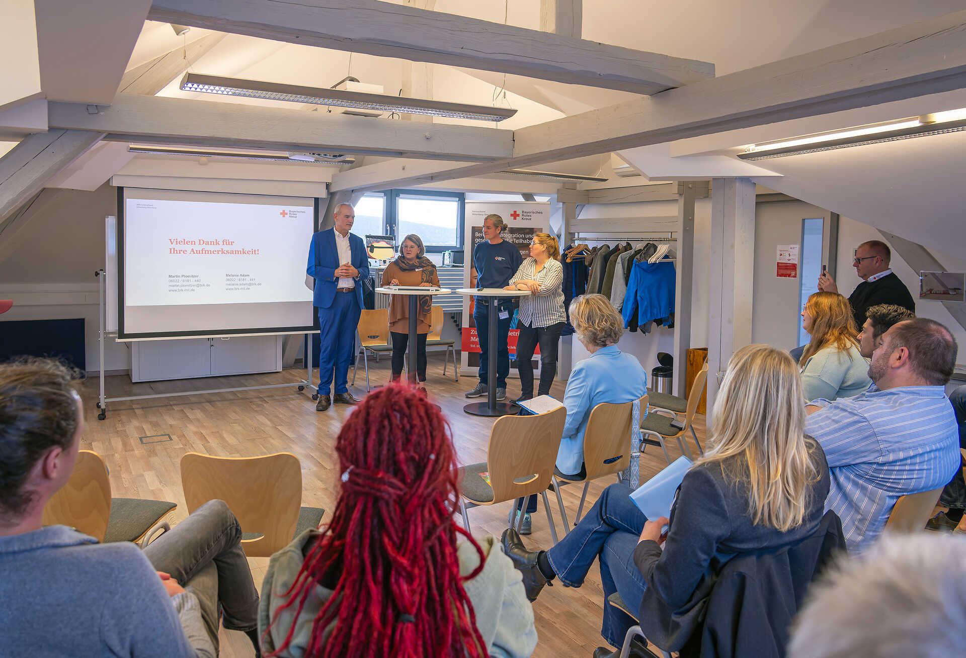 Beeindruckt nahmen die Teilnehmenden die Ausführungen von Edwin Pfeifer über den Kreisverband des Roten Kreuzes auf. Ob Rettungsdienst, ambulante Pflege, Tagespflege, Rot-Kreuz-Laden, Erste-Hilfe-Kurse, Schulbegleitung und vieles mehr: Das BRK leistet im Landkreis wichtige Arbeit. 2.200 Ehrenamtliche kamen im vergangenen Jahr auf über 68.000 Stunden, dazu kommen 207 Hauptamtliche einschließlich 18 Auszubildender. Man generiere 16,5 Millionen Umsatz pro Jahr und werbe rund 800.000 Euro Spendengelder ein, rechnete Pfeifer vor und stellte fest, dass man zu 98 Prozent fremdfinanziert sei und jedes Jahr schauen müsse, wie man den Haushalt finanziert.