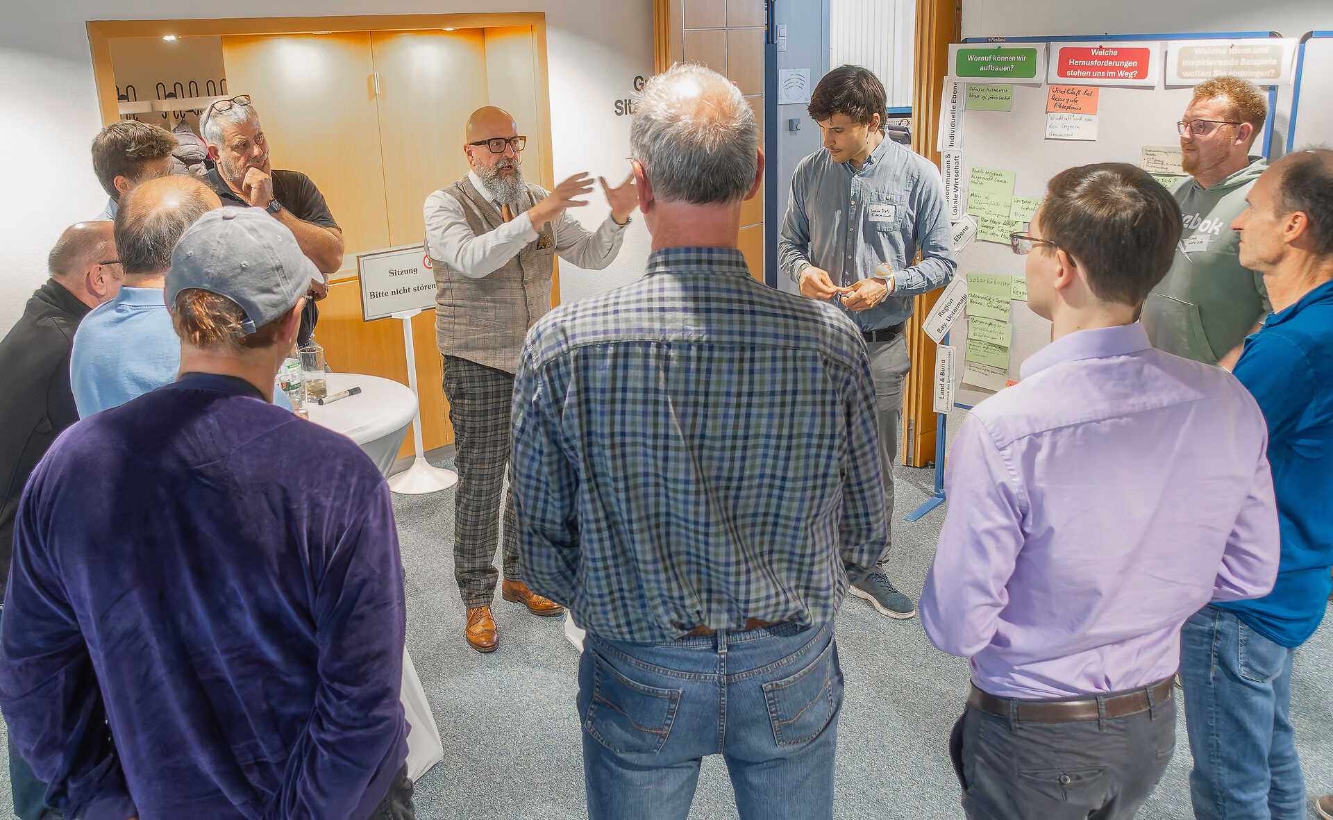 In vier Arbeitsgruppen gingen die Gäste unter Regie der B.A.U.M.-Mitarbeitenden Joshua Dietz, Michael Weber, Luisa Rau und Susan Wolf an die Arbeit. Themen waren die Erneuerbare Energieversorgung, klimafreundliche Mobilität, Klimaschutz in Land- und Forstwirtschaft sowie nachhaltiges Sanieren, Bauen und Wohnen. Dabei ging es darum, zunächst das bislang Erreichte zusammenzutragen. Anschließend wurden Herausforderungen identifiziert, ehe die Gäste gefragt waren, vorbildliche Ideen zu benennen. Alle Punkte wurden niedergeschrieben und auf Tafeln platziert. In der Folge formulierten die Teilnehmenden Maßnahmenideen, definierten ein Ziel, listeten notwendige Akteure und Klärungsbedarfe auf und nannten mögliche erste Schritte.