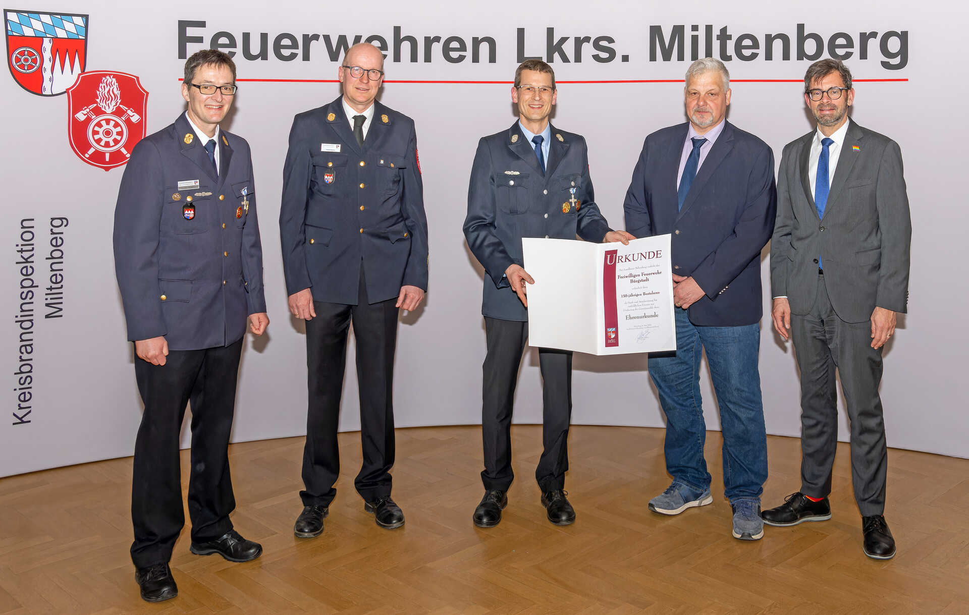 Eine große Stütze des Feuerwehrwesens im Landkreis sei die Bürgstadter Feuerwehr, die in diesem Jahr ihr 150-jähriges Bestehen feiert. Sie sei eine große, gut ausgebildete und verlässliche Feuerwehr, die auch über zwei Jahrzehnte mit dem Gerätwagen Gefahrgut einen wichtigen Beitrag im Löschzug Gefahrgut des Landkreises geleistet habe. In der überörtlichen Ausbildung wirke sie vielfältig mit, darüber hinaus leiste sie wertvolle Beiträge zur modularen Truppausbildung und zum Maschinistenlehrgang. Auch in der Planung der Hilfeleistungskontingente leisteten die Bürgstadter einen wichtigen Beitrag, so der Landrat. Ihm lag es am Herzen, auch auf die zahlreichen Mädchen und Jungen in der Jugend- und Kinderfeuerwehr zu verweisen, mit denen die Feuerwehr erfolgreiche Nachwuchsarbeit leistet. „Der Landkreis Miltenberg und die Kreisbrandinspektion sind der Feuerwehr Bürgstadt und dem Markt Bürgstadt für die erfolgreiche Zusammenarbeit über Jahrzehnte sehr dankbar“, schloss Scherf.