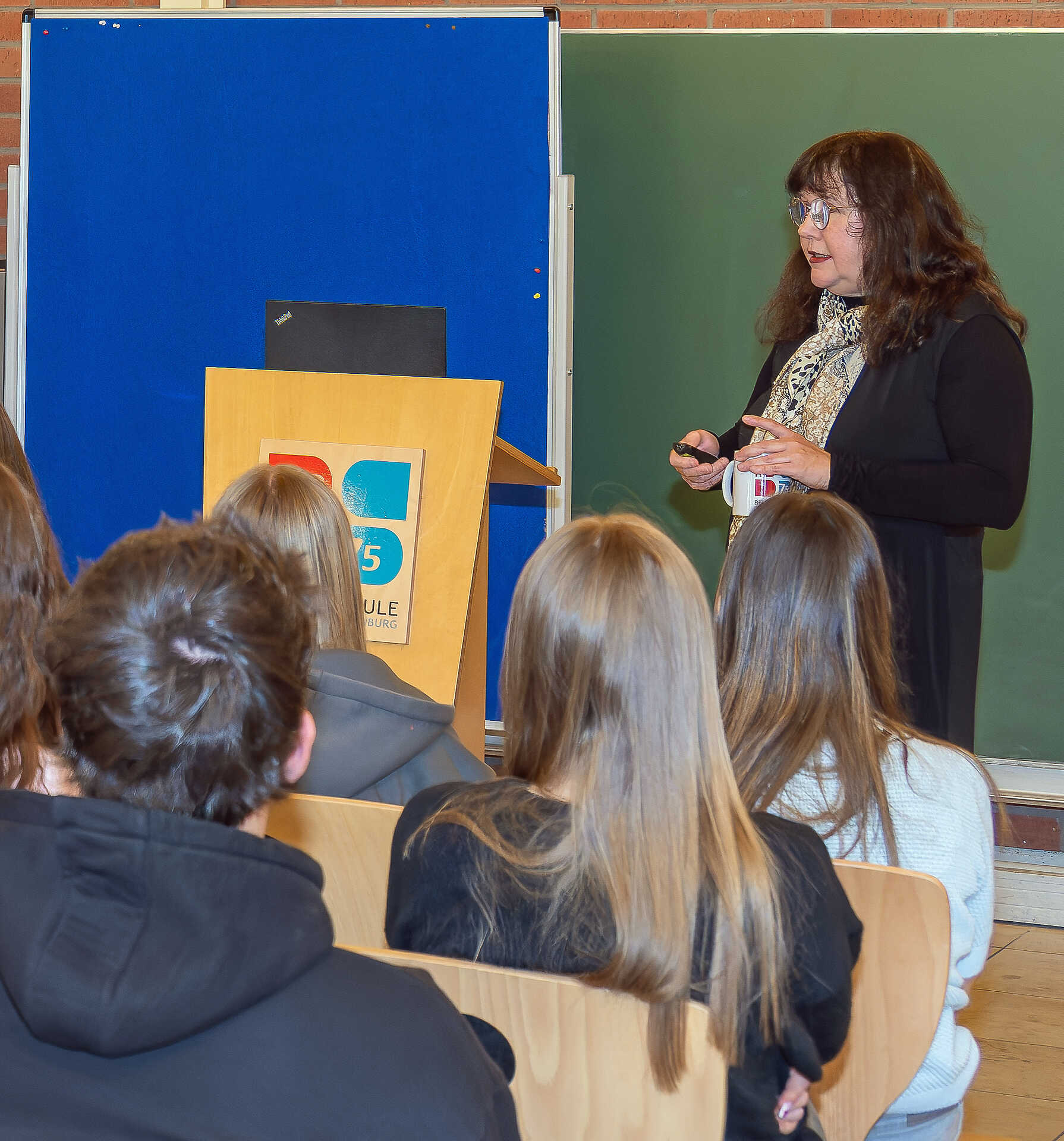 Aufmerksam verfolgten die Gäste den Vortrag von Birgit Mair vom Institut für sozialwissenschaftliche Forschung, Bildung und Beratung (ISFBB). Die Buch- und Filmautorin beschäftigt sich seit vielen Jahren mit dem Holocaust und seinen Opfern, spricht mit Überlebenden und verfolgt die rechtsextremistischen Tendenzen in Deutschland aufmerksam. Sie hat Einblicke in die Neonazi-Szene und weiß, wie Rechtsextreme Menschen fangen – mit gezielten Falschmeldungen in sozialen Medien, mit Umdeutung von Symbolen, mit der Verwendung rechter Codes. Dazu komme, dass sich die Rechten mit einem parlamentarischen Arm sogar legal zeigen. Mair gab den Schülerinnen und Schülern die Definition von Rechtsextremismus an die Hand, nannte die Namen einiger Neonazi-Gruppierungen und stellte fest: „Viele rechte Strömungen ziehen an einem Strang.“ Eine Gegenstrategie sei, Fakten zu checken, auch nannte sie Anlaufstellen beim Auftreten von rechter, rassistischer, antisemitischer und digitaler Gewalt.