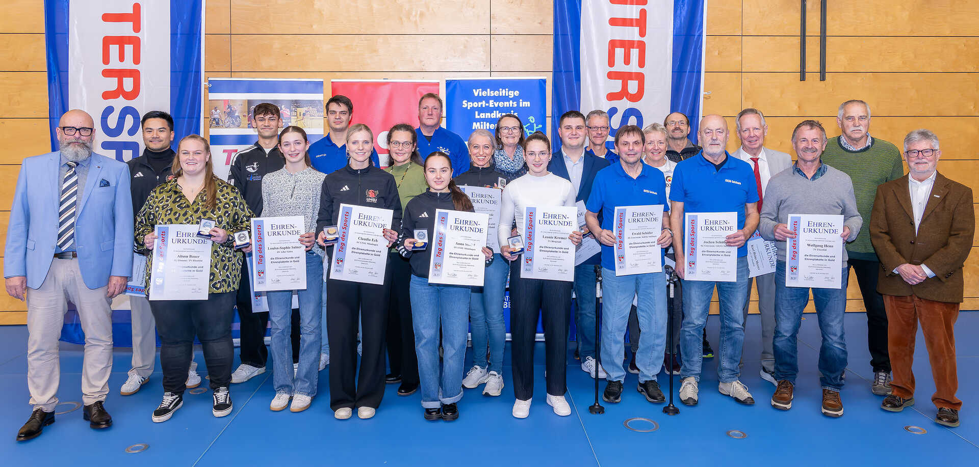 Nach den rund 80 Silber-Ehrungen (Landesmeister, zweite und dritte Plätze bei Deutschen Meisterschaften) wurden die Gold-Ehrungen (Erfolge auf Bundes- und internationaler Ebene) übergeben an Anja Ühlein (Judo, Judoclub Obernburg), Martina Schneider (Kegeln, Kegelfreunde Obernburg), Richard Przybyla (Leichtathletik, LAZ/TuSpo Obernburg), Karl Heinz Messer (Leichtathletik, LAZ/TV Elsenfeld), Heide Moos (Synchronschwimmen, MTV Urberach/Amorbach-Boxbrunn), Lukas Stahl (Gespannfahren, RFV Wiesenhof Obertshausen/Elsenfeld-Hofstetten), Celine Stapf, Niklas Kreuzmann und Louisa-Sophie Salner (alle Kunstradfahren, RV Adler Soden), Alison Bauer (Judo/Brasilian, SG Eltmann/TV Elsenfeld), Jochen Schüßler und Ewald Schäfer (beide Schießen, SG Untermain/KKSG Sulzbach), Nawapon Pattanasakoo, Claudia Eck, Jasna Durdevic, Anna Stößel und Lukas Grimm (alle Karate, SV UNSU Mömlingen), Leonie Kremer (Leichtathletik, TV Bürgstadt), Wolfgang Henn und Bertram Stapf (beide Faustball, TV Elsenfeld), Alexander Rexroth, Helger Schader und Ken Pfeiffer (alle Kanusport, WSG Kleinheubach).