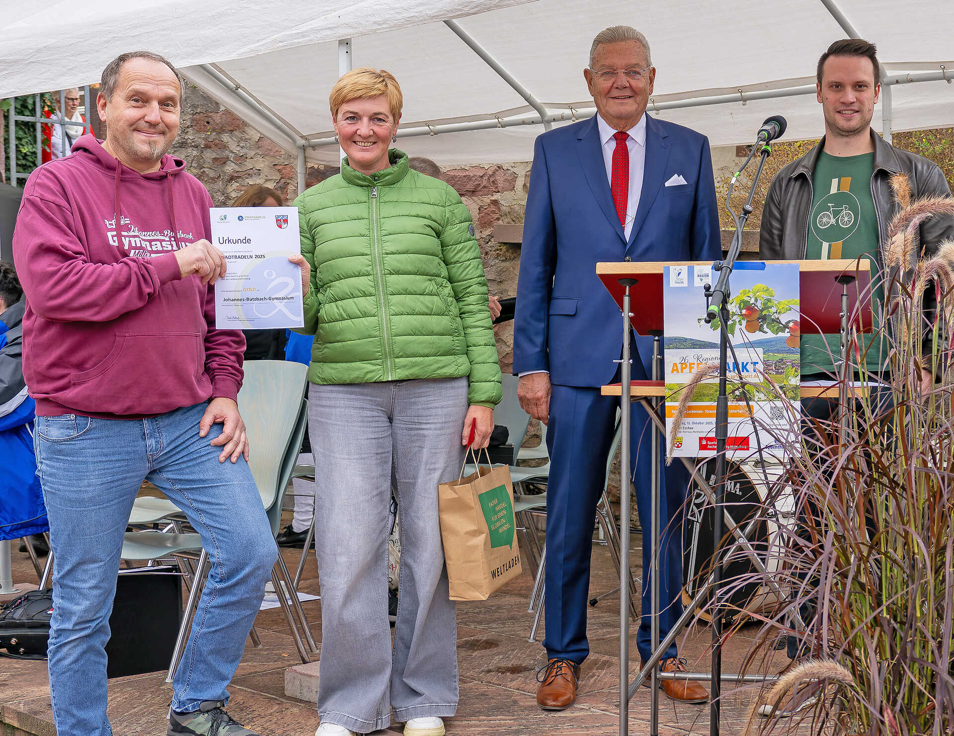 Der Schulleiter des Miltenberger Johannes-Butzbach-Gymnasiums, Ansgar Stich, und Lehrerin Claudia Jörg freuten sich über den Sieg in der Schulwertung, in der das JBG das größte Team stellte und die meisten Teamkilometer zurücklegte. Dazu gratulierten auch stellvertretender Landrat Günther Oettinger und der Mobilitätsbeauftragte des Landkreises, Tim Haas. Foto: Winfried Zang